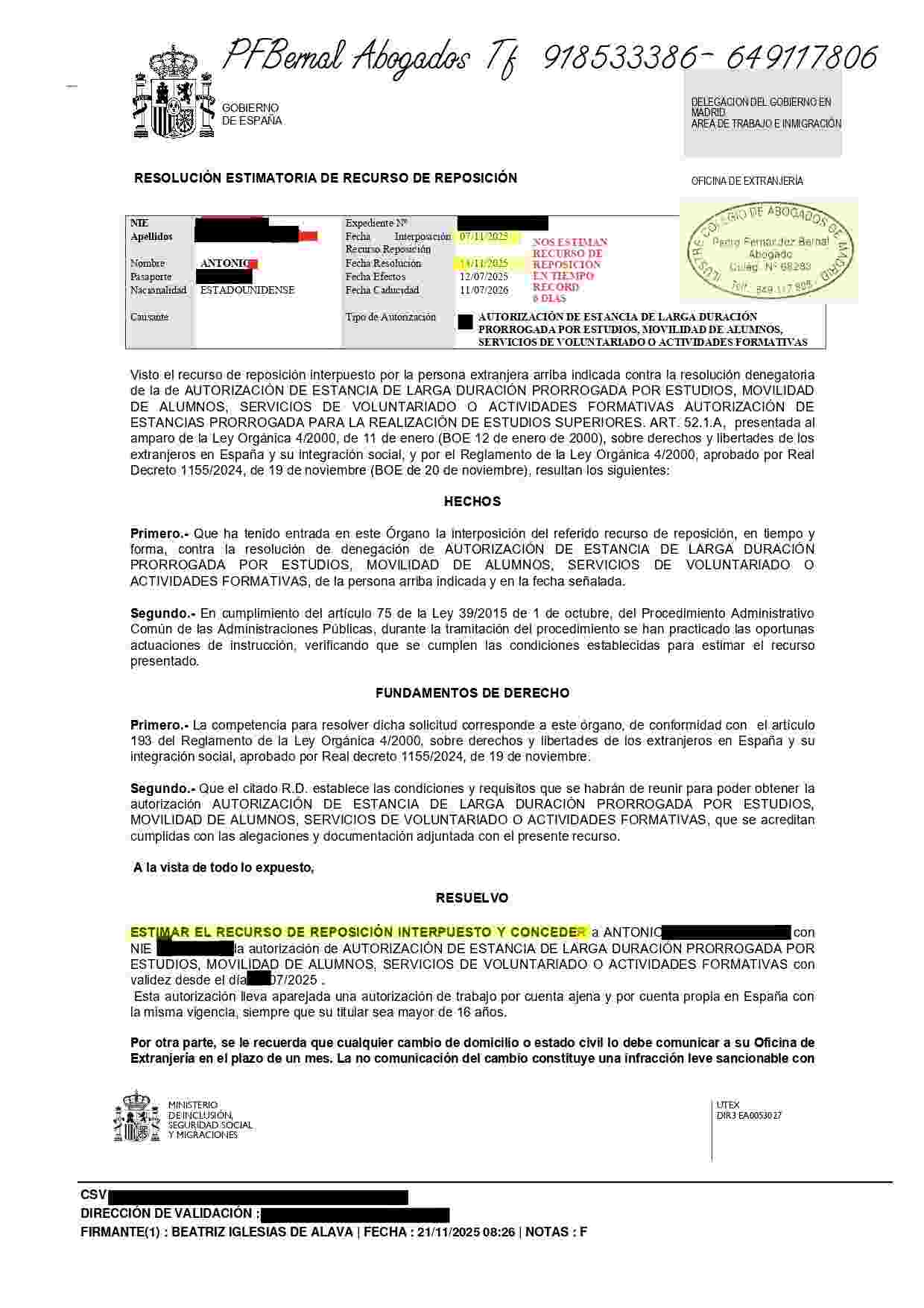 En este caso en nov. 2025 logramos el recurso de prorroga de estudiante, cuando le habian denegado la prorroga por no haber presentado por mercurio, siendo obligatorio desde los cambios de reglamento 1155/2024 de mayo de 2025, logramos estimacion de recurso en 6 dias, tiempo record, reconociendo derecho a la prorroga de este estudiante de 4 grado de Filosofia en UCM de Madrid.